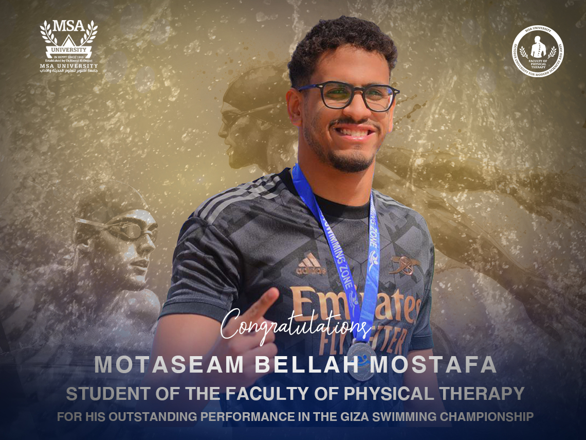 The Faculty of Physical Therapy at October University for Modern Sciences and Arts proudly celebrates the remarkable success of Motaseam Bellah Mostafa Aly, a Level 1 student who delivered an outstanding performance at the Giza Swimming Championship where he achieved: