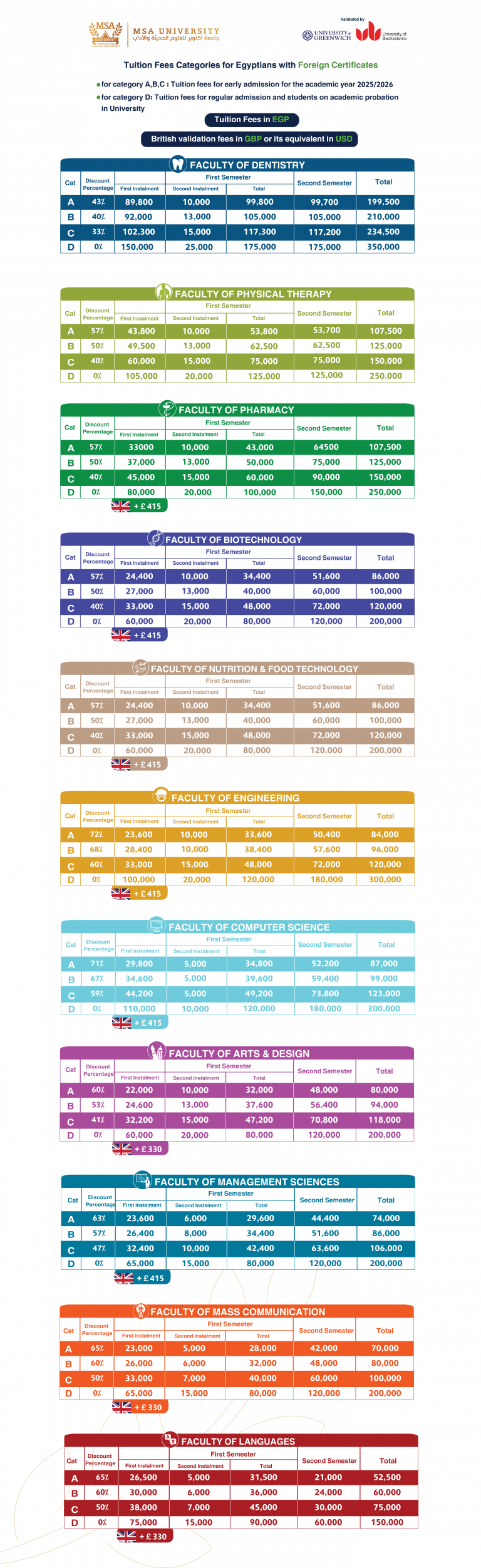 - فئات المصروفات الدراسية سارية حتى سنة التخرج لجميع الطلاب المتقدمين الجدد والمحولين من الجامعات الأخرى الحكومية أو الخاصة