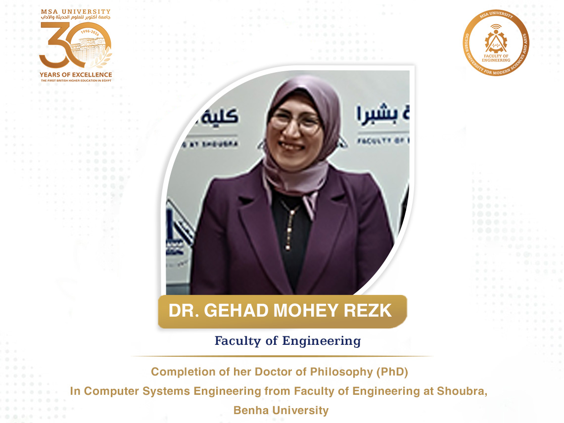 October University for Modern Sciences and Arts (MSA University) and the Faculty of Engineering proudly extend their sincere congratulations to Dr. Gehad Mohey Rezk Youssef on the successful attainment of her Doctor of Philosophy (Ph.D.) in Computer Systems Engineering.