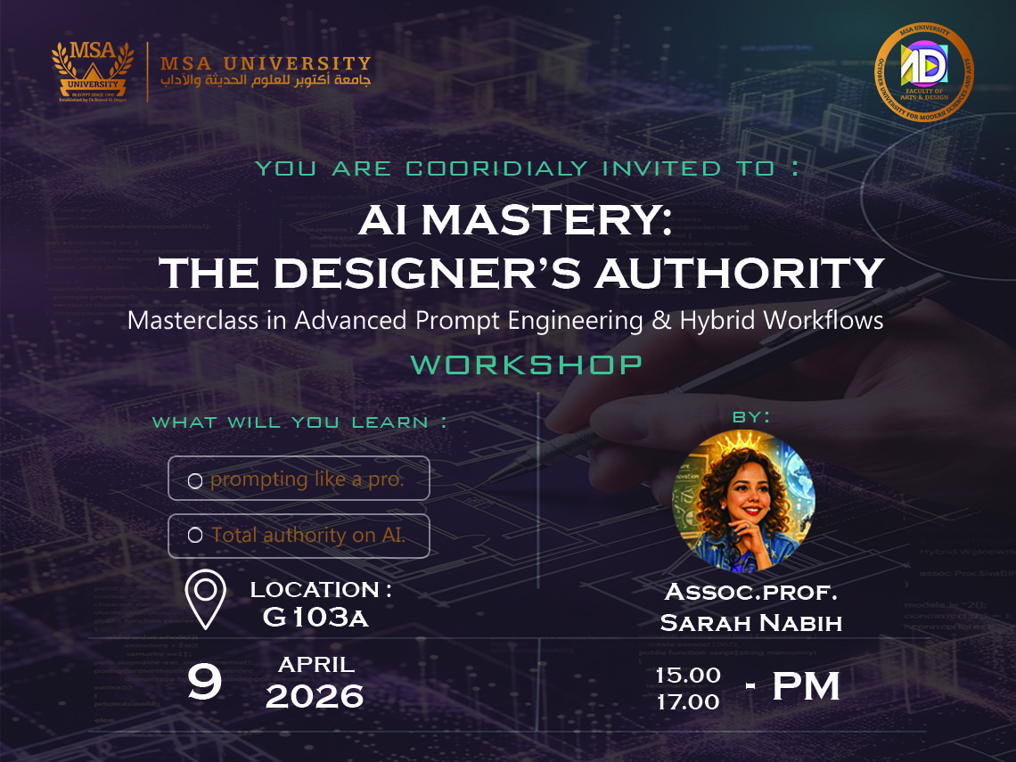 The Faculty of Arts and Design at October University for Modern Sciences and Arts (MSA University) is hosting the masterclass “AI Mastery: The Designer’s Authority – Advanced Prompt Engineering & Hybrid Workflows.”