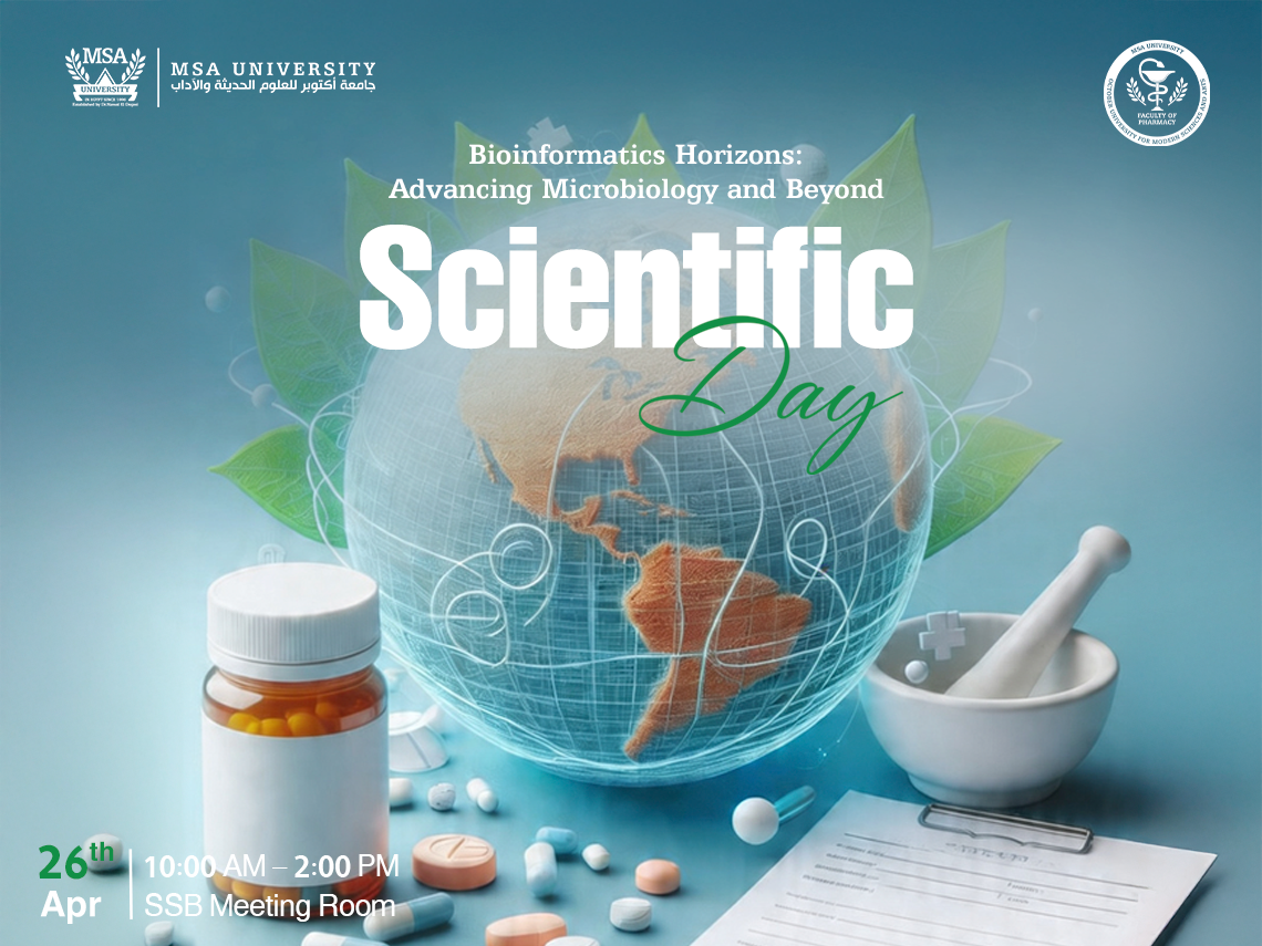 The Department of Microbiology and Immunology, Faculty of Pharmacy, at October University for Modern Sciences and Arts (MSA) is honoured to invite you to our upcoming Scientific Day. This event explores the transformative power of microbial genomics, data-driven microbiology, and high-impact applications within the pharmaceutical biotechnology sector.