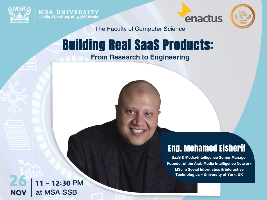 The Faculty of Computer Science at October University for Modern Sciences and Arts (MSA) is pleased to announce an exclusive upcoming talk entitled “Building Real SaaS Products: From Research to Engineering”, delivered by Eng. Mohamed Elsherif, SaaS & Media-Intelligence Senior Manager, Founder of the Arab Media Intelligence Network, and MSc graduate in Social Informatics & Interactive Technologies from the University of York, UK.