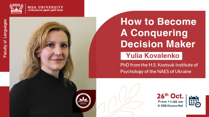 The Faculty of Languages, MSA, is pleased to invite you to a psychology session titled: How To Become A Conquering Decision Maker. The lecture will be delivered by Yulia Kovalenko, PhD in psychology.