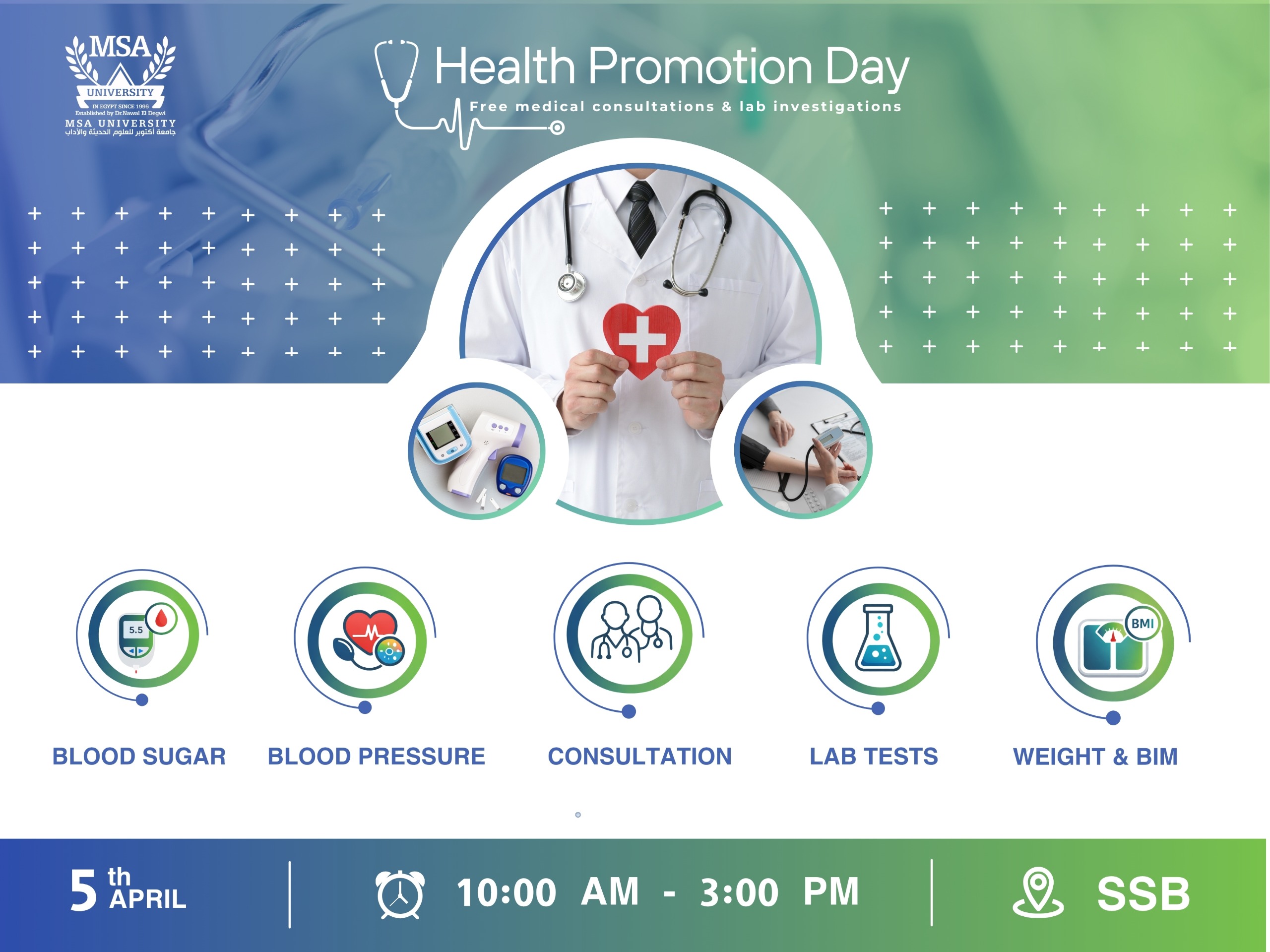 October University for Modern Sciences and Arts (MSA) is committed to fostering a healthy and supportive campus environment by providing free medical consultations and laboratory investigations for students and staff. This initiative aims to promote health awareness, encourage early disease detection, and support academic and professional performance through enhanced wellbeing.