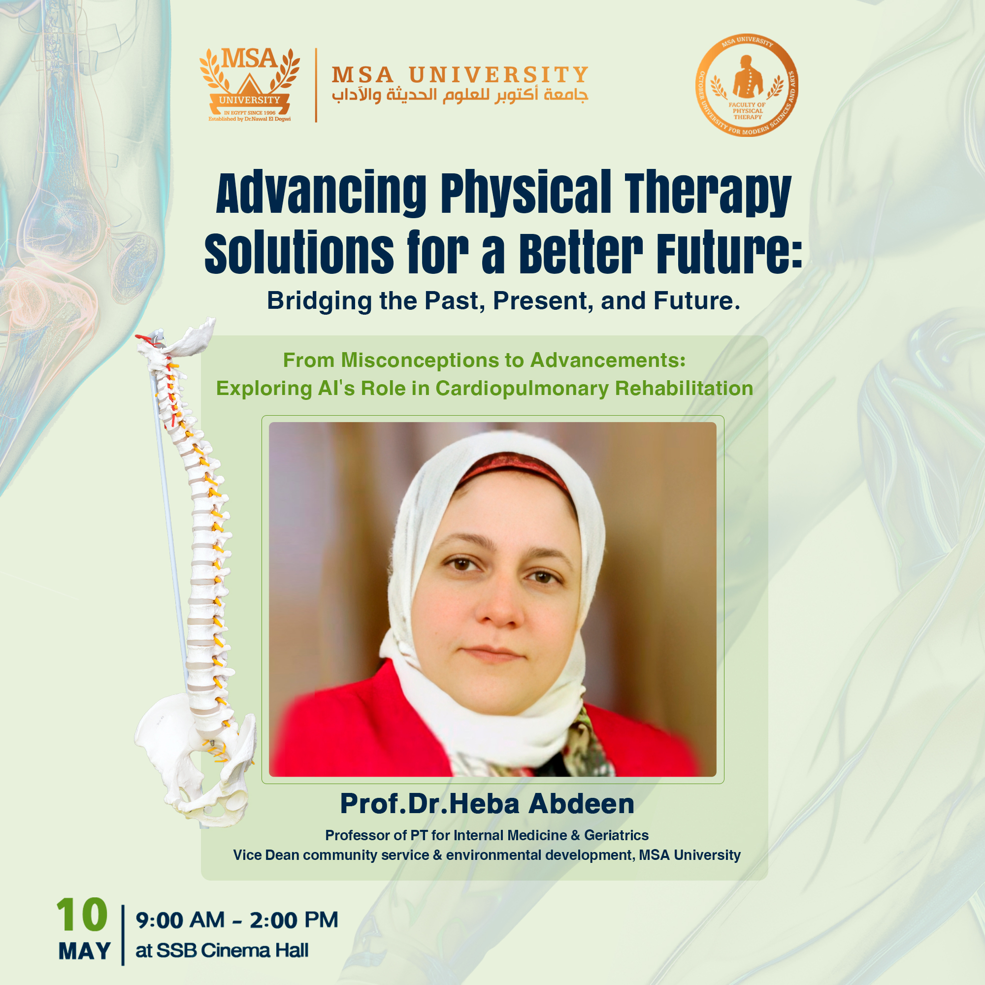 The Faculty of Physical Therapy at October University for Modern Sciences and Arts (MSA) cordially invites you to the annual Scientific Day, a dynamic forum entitled “Advancing Physical Therapy Solutions for a Better Future: Bridging the Past, Present, and Future” under the patronage of Prof. Dr. Khairy Abdelhameed, MSA University President and Prof. Dr. Olfat Diab, Dean of the Faculty of Physical Therapy.