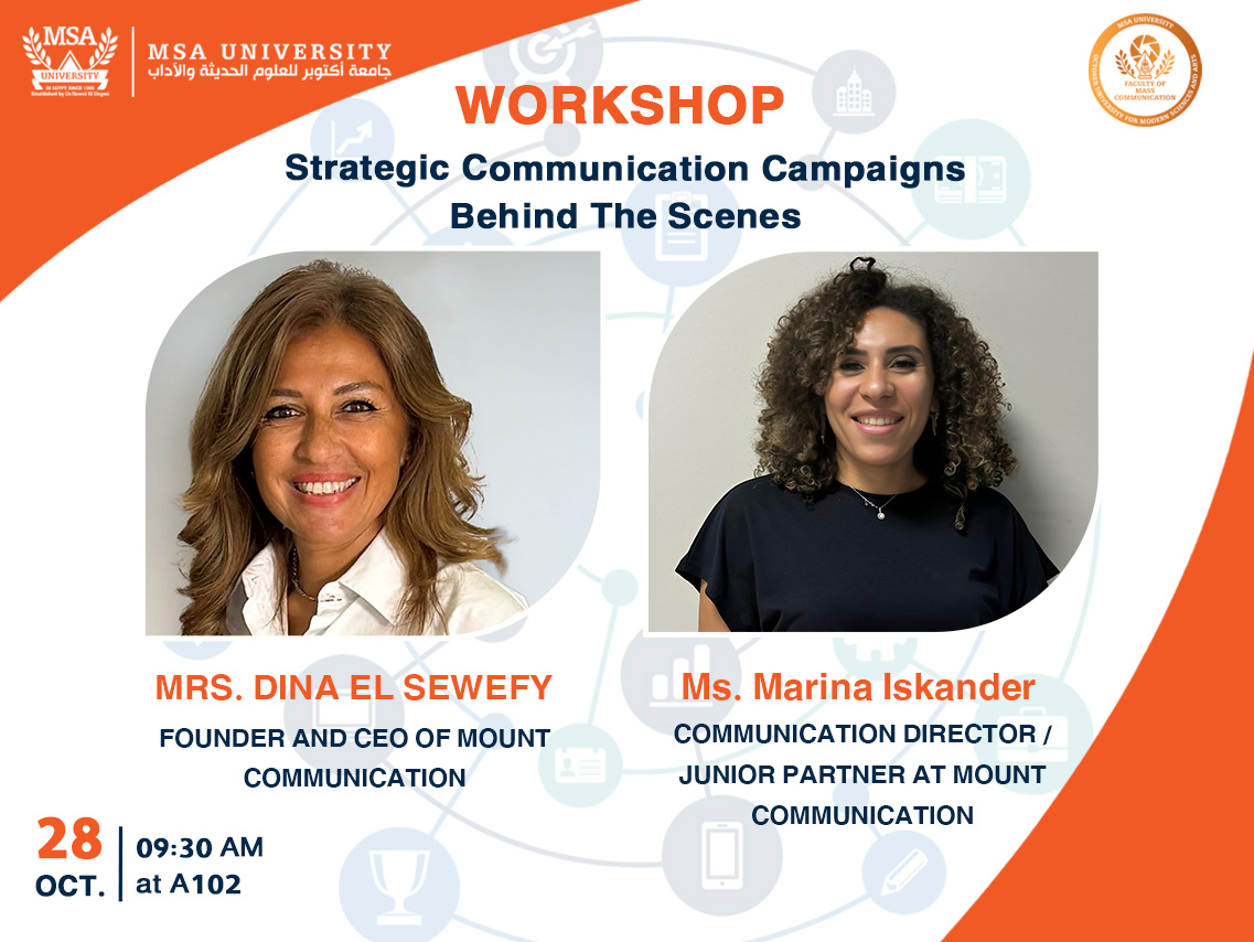 The Public Relations and Advertising Department at the Faculty of Mass Communication, October University for Modern Sciences and Arts (MSA) is delighted to host an inspiring workshop titled “Strategic Communication Campaigns | Behind the Scenes.”