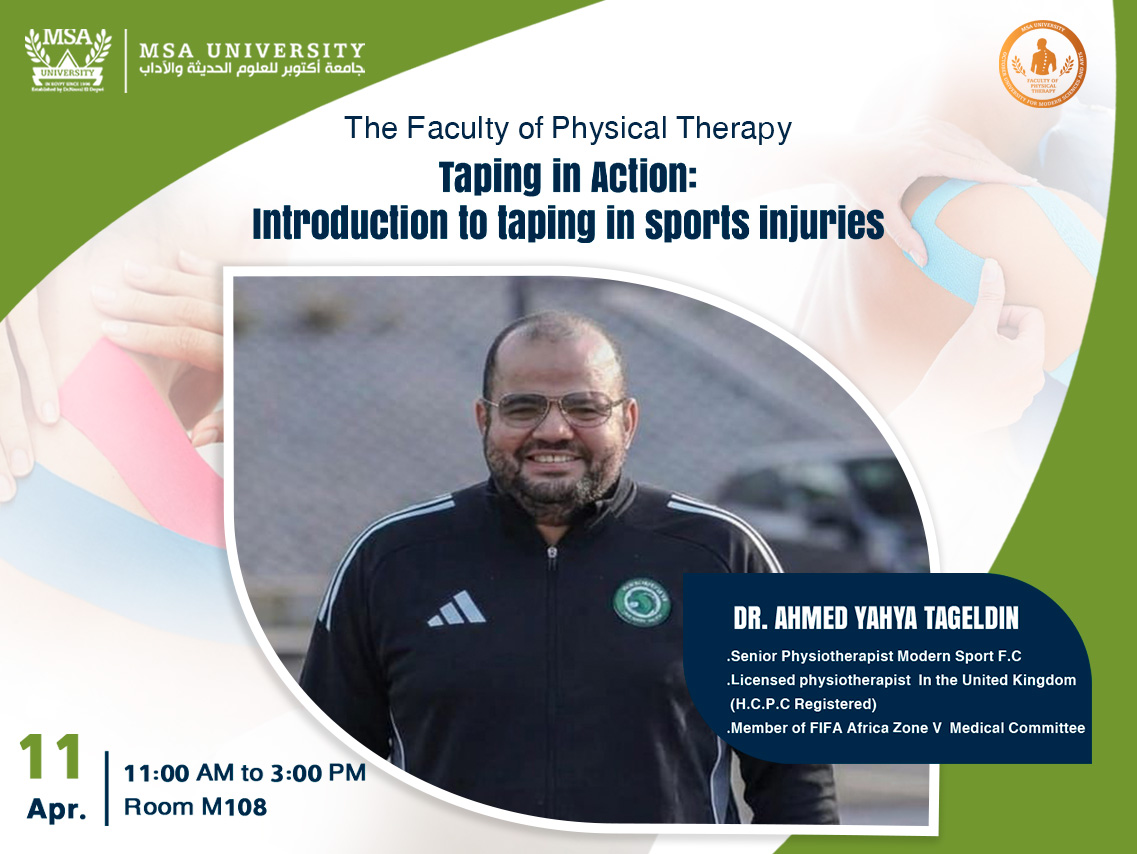 In continuation of the educational process and commitment to clinical excellence, continuing of series of workshops, the Orthopedic Department at the Faculty of Physical Therapy at October University for Modern Sciences and Arts (MSA) is pleased to announce a hands-on clinical workshop tailored for level 4-5 physical therapy students focusing on effective taping methods for musculoskeletal and sports injuries titled Taping in Action: Introduction to Taping in Sports Injuries”, under the patronage of Prof. Dr. Olfat Diab.