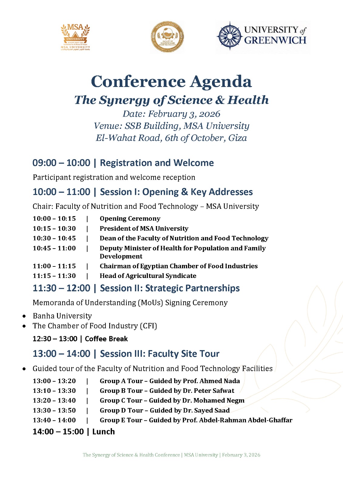 The conference will be held under the patronage of Dr. Nawal El Degwi, Chairman of the Board of Trustees, and in the presence of Prof. Nader Elbokle, President of MSA University, and Dr. Ahmed Nada, Dean of the Faculty of Nutrition and Food Technology.