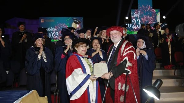 Professor Adrian, President of the University of Bedfordshire (UK), awarded Dr. Nawal El-Degwi an Honorary Doctorate in recognition of her outstanding contributions to education. This honor reflects the success of the academic partnership, which has resulted in the graduation of distinguished cohorts of university students receiving both Egyptian and British education simultaneously.