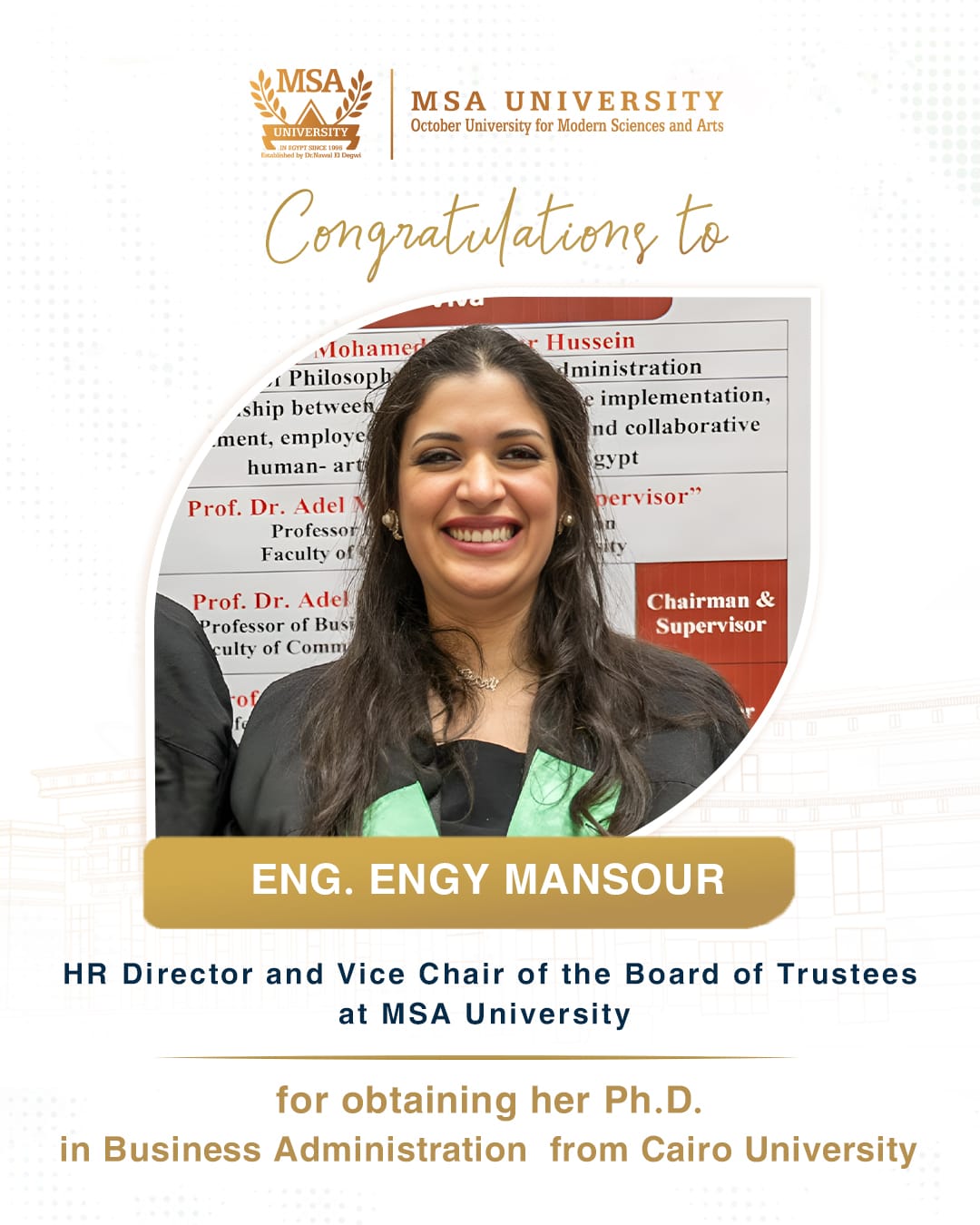 October University for Modern Sciences and Arts (MSA) congratulates Eng. Engy Mansour, Director of the Human Resources Department and Vice Chairperson of the Board of Trustees, who obtained her Ph.D. in Business Administration from Cairo University with a thesis titled “The Relationship between Artificial Intelligence Implementation, E-recruitment, Employee turnover intention, and collaborative human-artificial intelligence”.