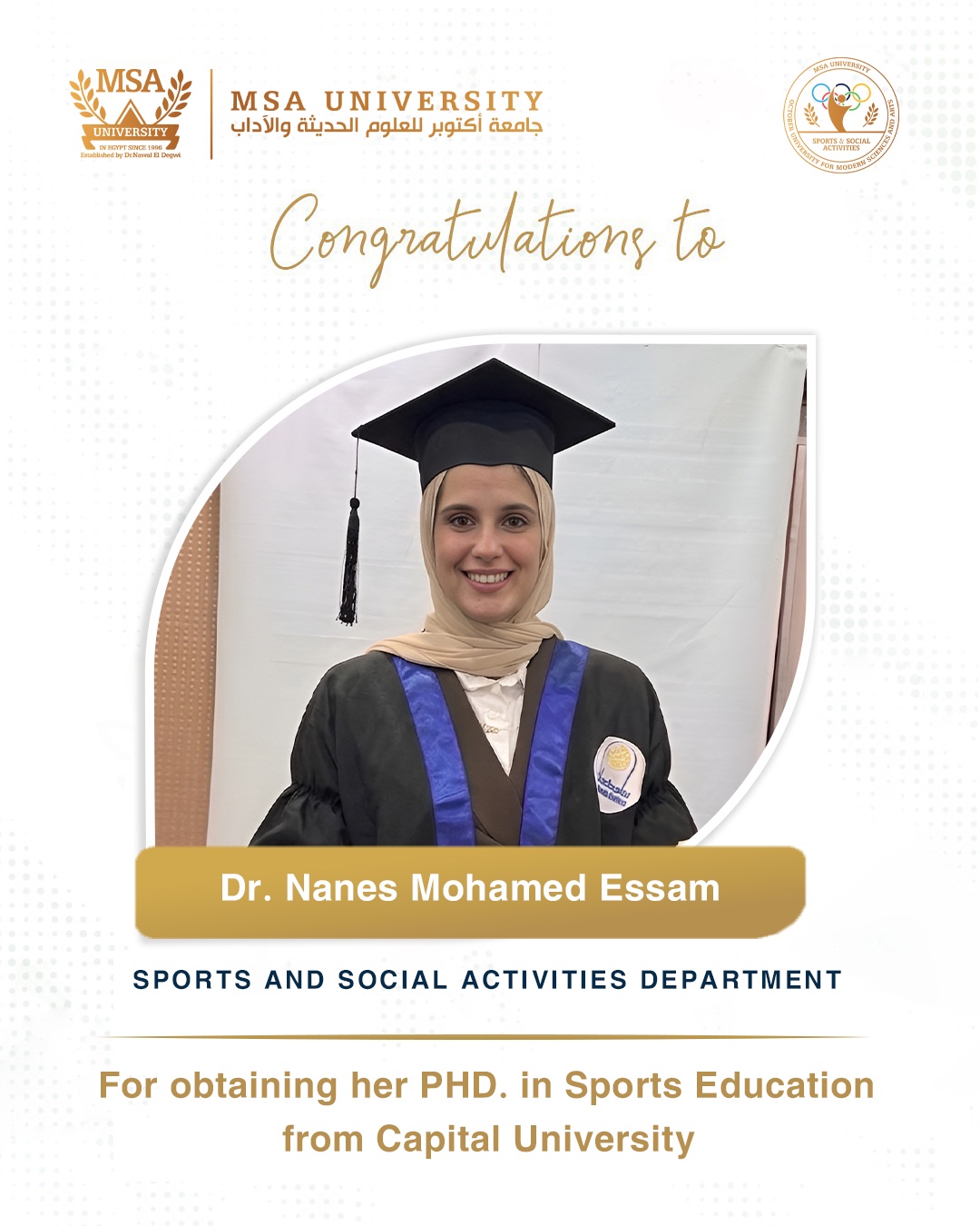 October University for Modern Sciences and Arts (MSA) and the Social & Sports Department proudly congratulate Dr. Nanes Mohamed Essam, who obtained her Ph.D. in Sports Education. Her doctoral dissertation is titled: “Training Using The Sliding Discs Tool Its Effect on Some Physical And Skills Variables For Volleyball Players” from Capital University.