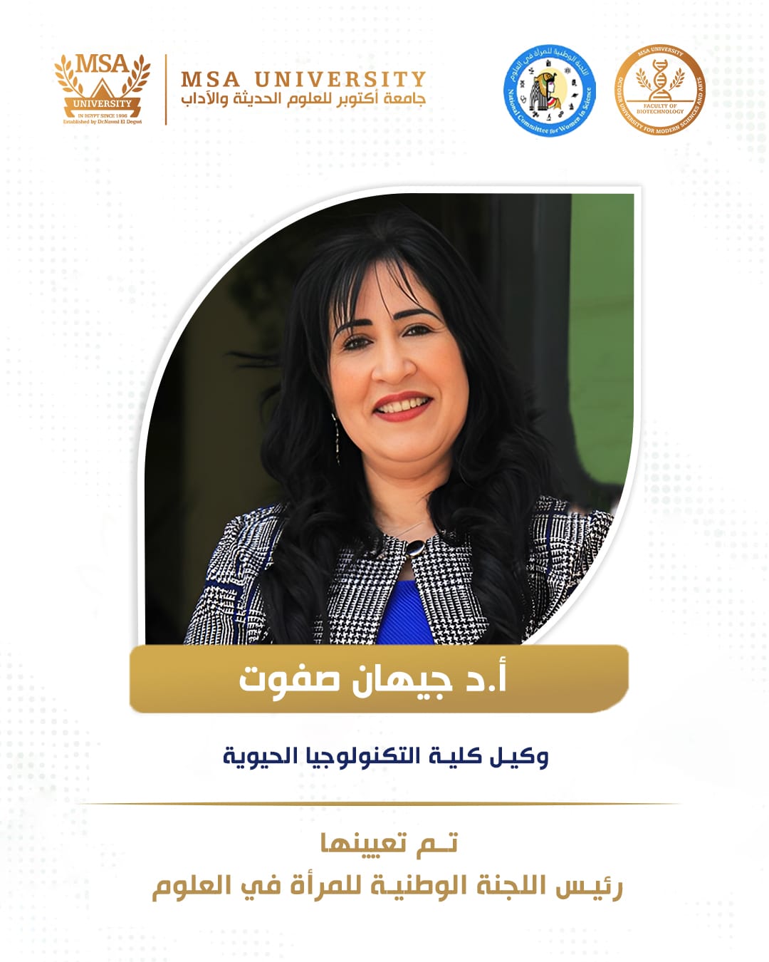 October University for Modern Sciences and Arts (MSA) proudly extends its heartfelt congratulations to Prof. Gehan Safwat, Vice Dean of the Faculty of Biotechnology, on her election as the President of the National Committee for Women in Science, in recognition of her distinguished international career and outstanding scientific contributions.