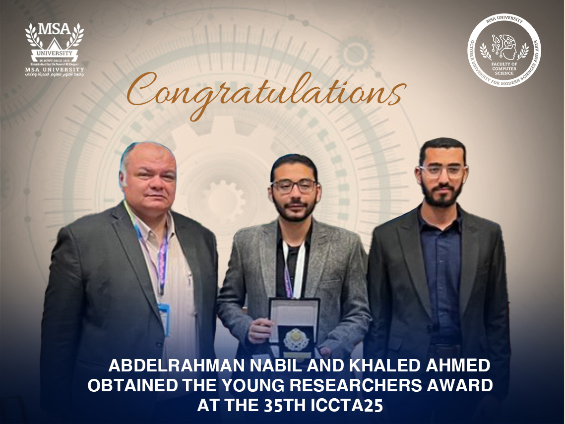 October University for Modern Sciences and Arts (MSA) and the Faculty of Computer Sciences are proud to announce that Abdelrahman Nabil and Khaled Ahmed, under the supervision of Prof. Tamer Nassef, have won the Young Researchers Award at the 35th …