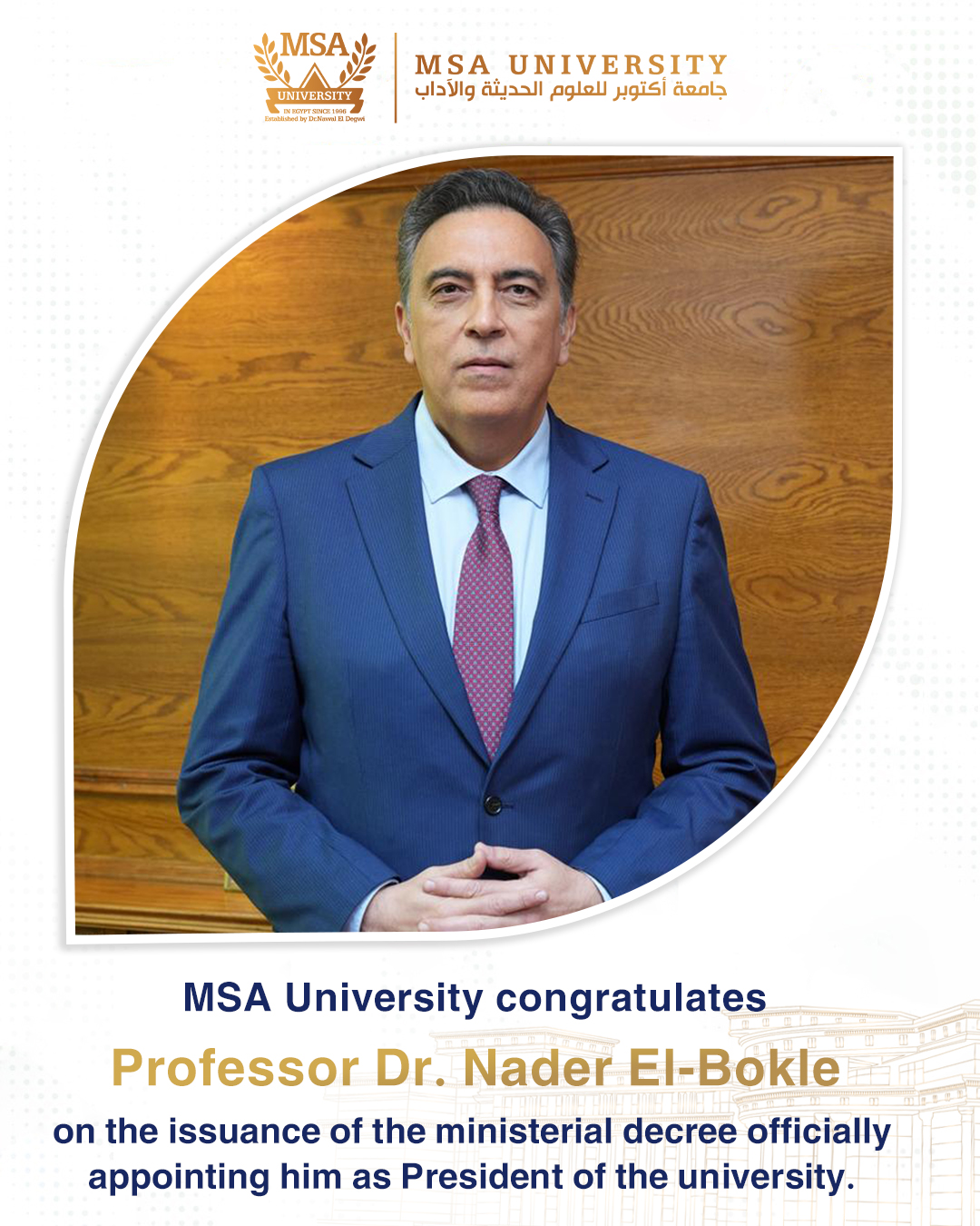 The October University for Modern Sciences and Arts (MSA) community — faculty members, teaching assistants, staff, and students ، extends its heartfelt congratulations to H.E. Professor Dr. Nader Elbokle, wishing him every success and expressing full confidence in his leadership to guide the university towards