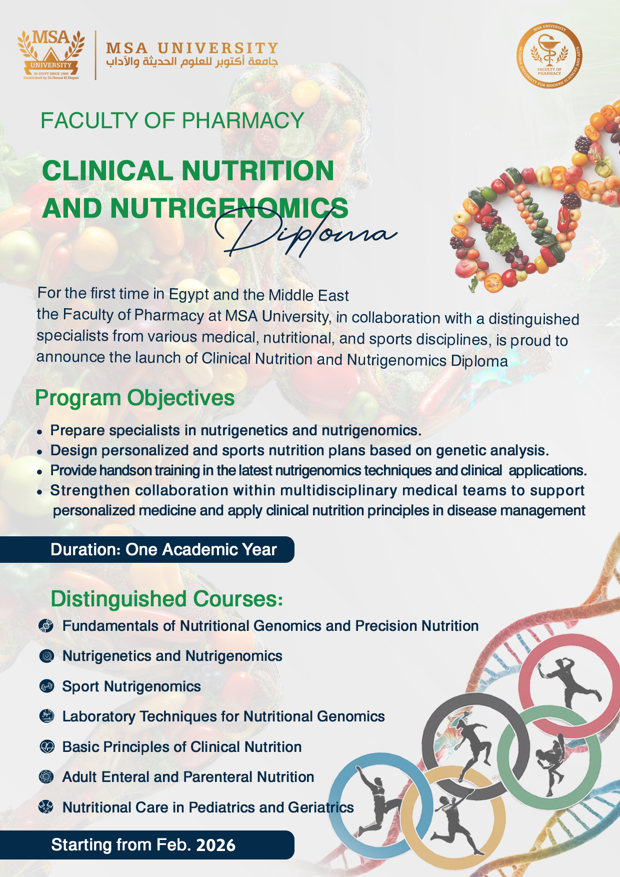 For the first time in Egypt and the Middle East the Faculty of Pharmacy at MSA University, in collaboration with distinguished specialists from various medical, nutritional, and sports disciplines, is proud to announce the launch of Clinical Nutrition and Nutrigenomics Diploma