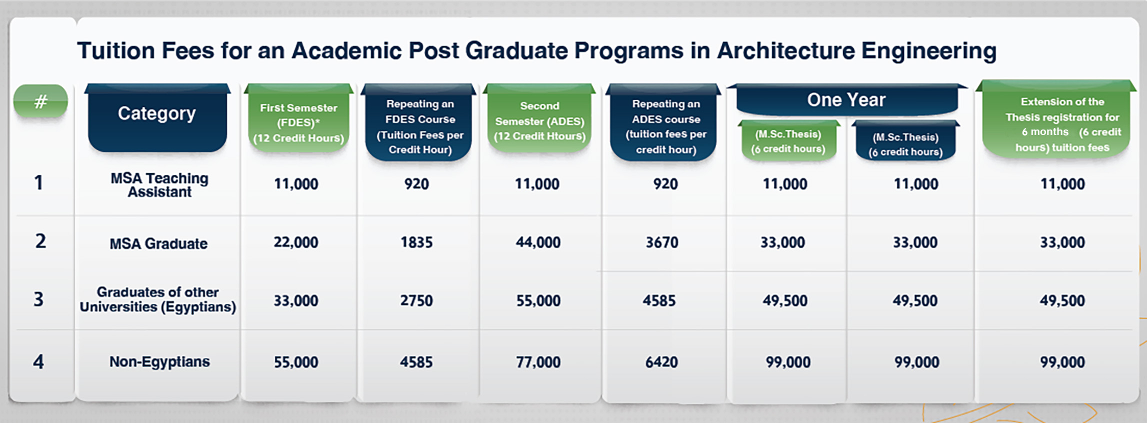 The post-graduate programs in Sustainable Architecture Design offered by the Department of Architectural Engineering at MSA University comprise 3 programs whose duration and awards are as follows: