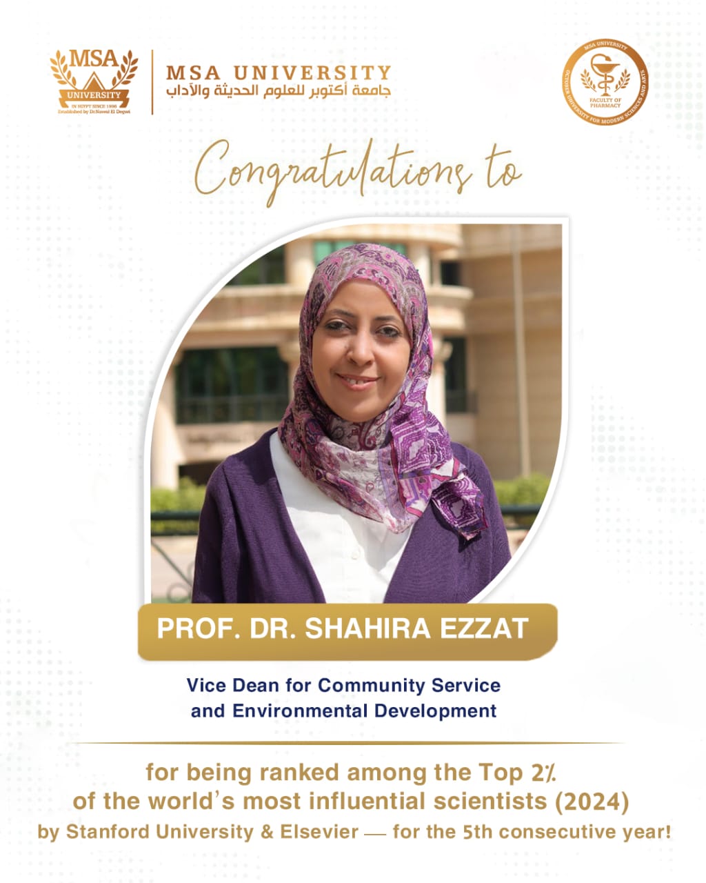The Faculty of Pharmacy at October University for Modern Sciences and Arts (MSA) proudly extends its sincere congratulations to Prof. Dr. Shahira Ezzat – Vice Dean for Community Service and Environmental Development for- being selected—for the fifth consecutive year—among the Top 2% of the most influential scientists worldwide for the year 2024, according to the Stanford University and Elsevier global classification.