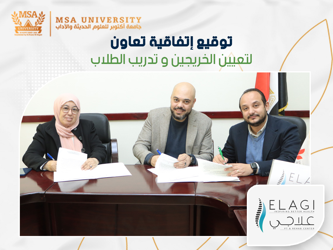 وقعت أ. د. ألفت دياب عميد كلية العلاج الطبيعي إتفاقية تعاون مع مركز علاجي للعلاج الطبيعي والتأهيل، بحضور د. بطرس جورج حبيب المدير العام لمراكز علاجي