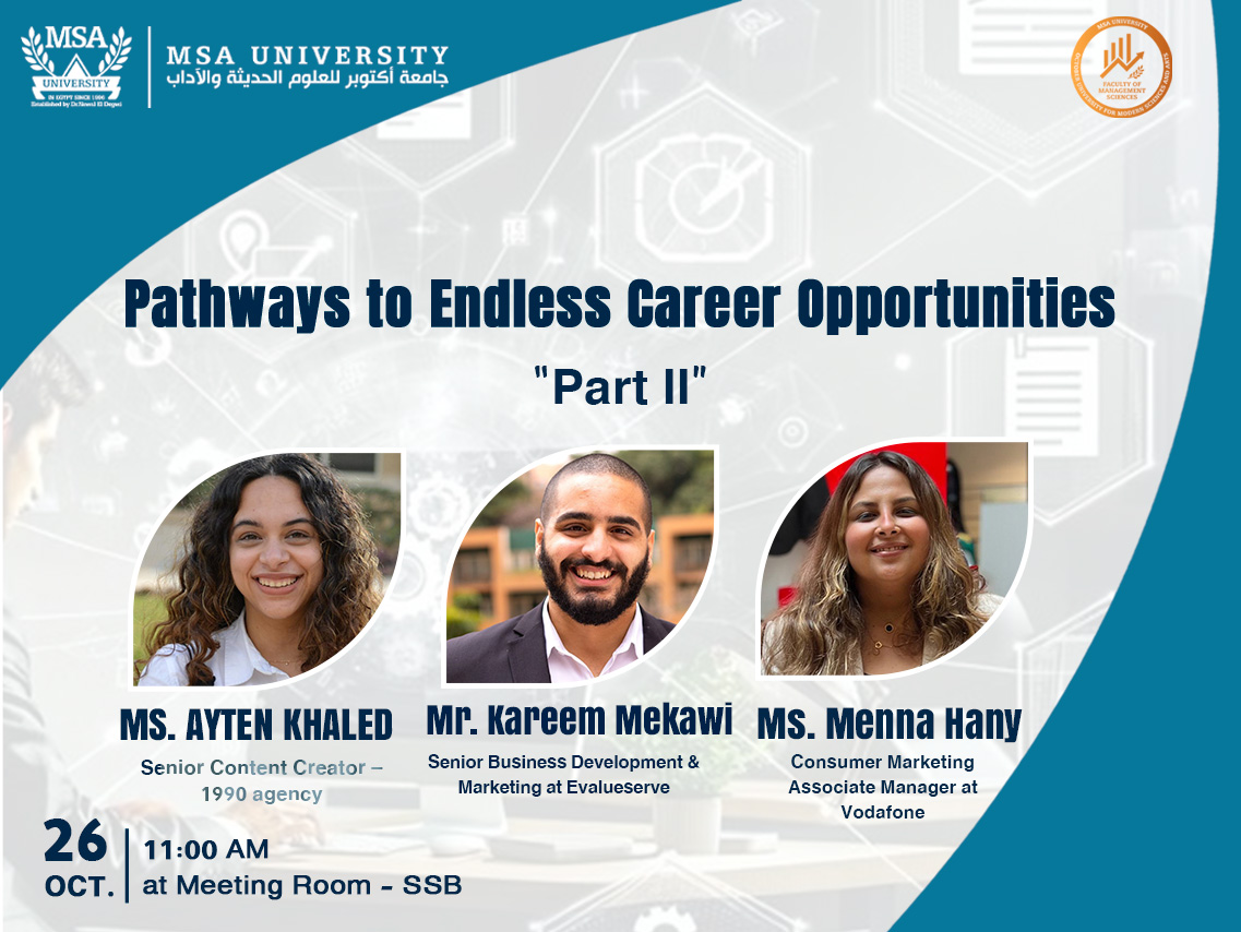 The Faculty of Management Sciences at October University for Modern Sciences and Arts (MSA) is pleased to invite students to attend the second session of the “Pathways to Endless Career Opportunities” series. This engaging guest session aims to help students …