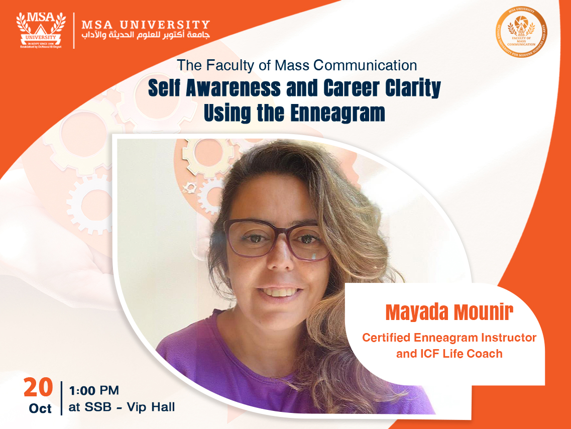 The Faculty of Mass Communication at October University for Modern Sciences and Arts (MSA) is inviting you to attend the “Self awareness and career clarity using the enneagram” presented by Ms. Mayada Mounir, a certified Enneagram Instructor and an ICF …