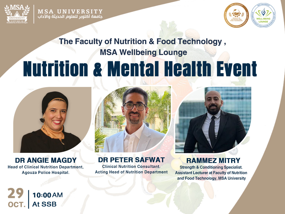The Faculty of Nutrition and Food Technology at October University for Modern Sciences and Arts (MSA), in collaboration with the MSA Wellbeing Center, are conducting a Mental Health Day to illuminate the idea of the importance of nutrition on our …